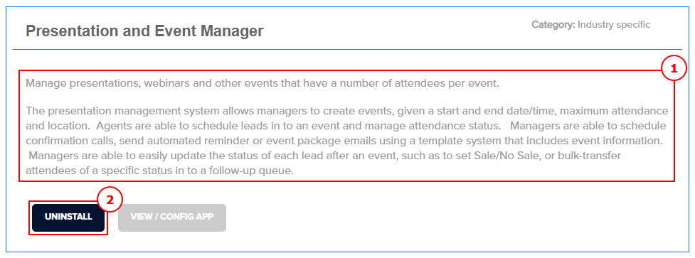 To install an App or Integration, review the Description (1) to confirm that the functionality no longer meets your needs. When you're ready, click the Uninstall button (2) to proceed.