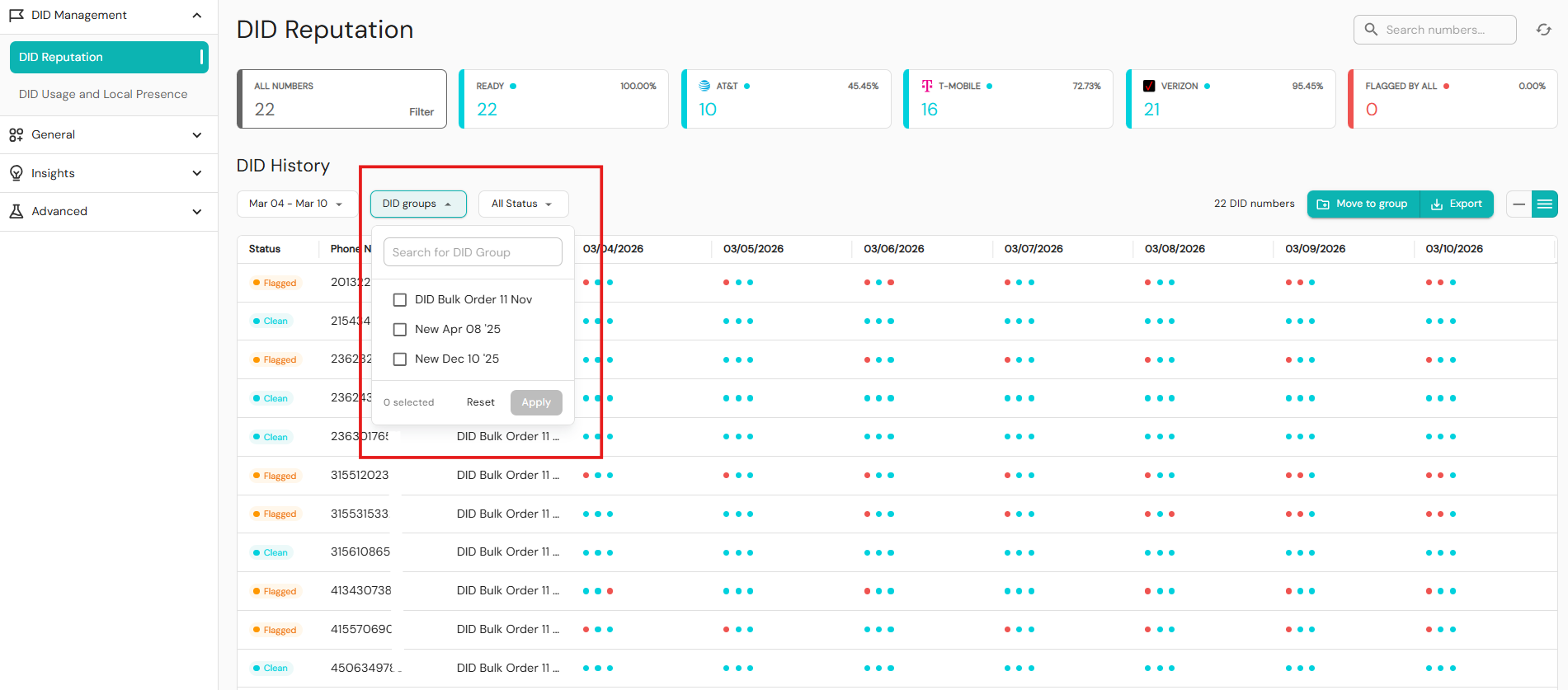 DID groups filter: Filter by active DID Groups.